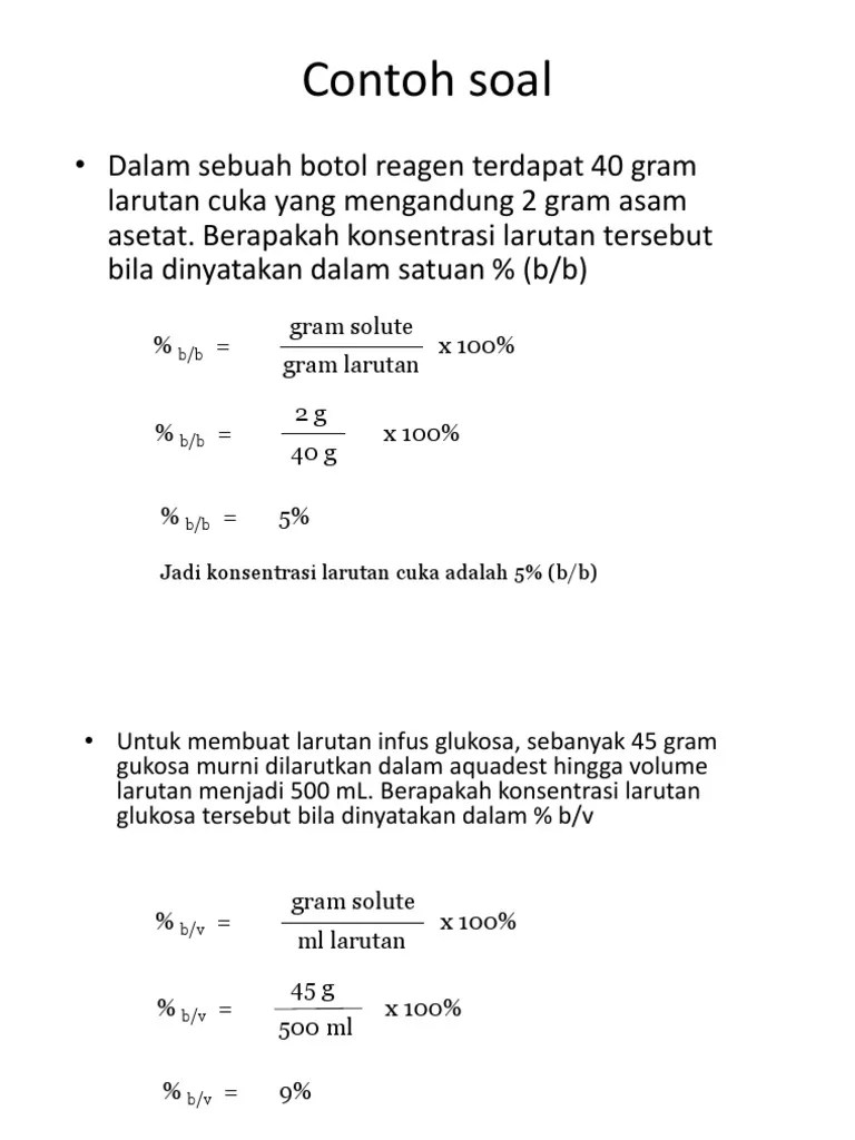 Jadi satuannya akan kembali ke mg/kg. Bpj adalah bagian per juta atau part per million (ppm), yaitu massa (mg) zat dalam setiap 1 kg campuran. Kamu dapat download modul & contoh soal serta kumpulan latihan soal dalam. Contoh soal dan jawaban : Hitung berapa persen massa nacl yang dibuat.